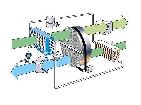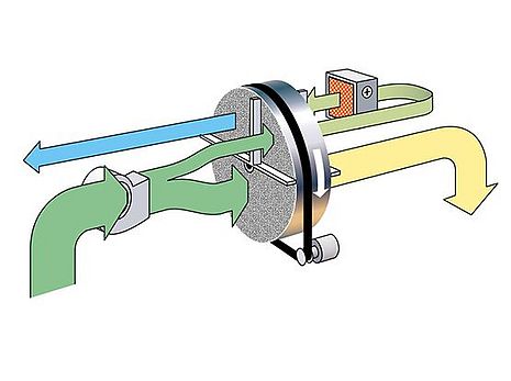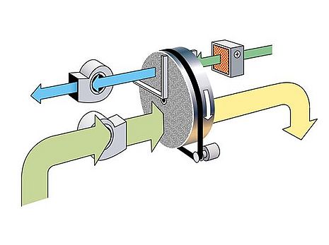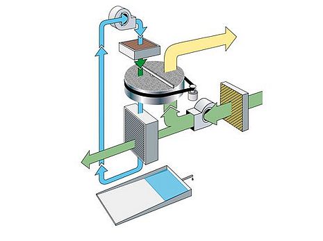 Die im Prozessluftsektor vom Rotor aufgenommene Feuchte wird durch die kontinuierliche Rotordrehung in den beheizten Regenerationsbereich gebracht, wo die Austreibung des Wasserdampfes mittels Warmluft erfolgt.