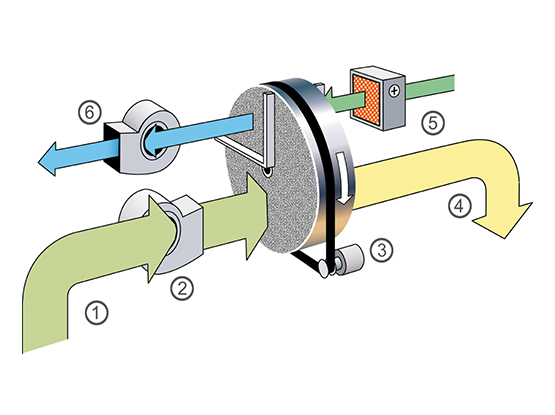 Die erhitzte Regenerationsluft verdampft im Gegenstrom die zuvor vom Rotor aufgenommene Feuchtigkeit und wird als Feuchtluft ins Freie geführt.